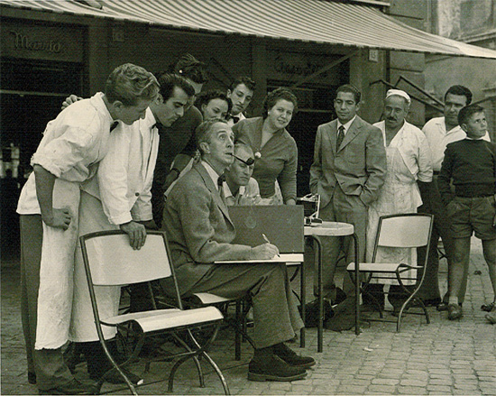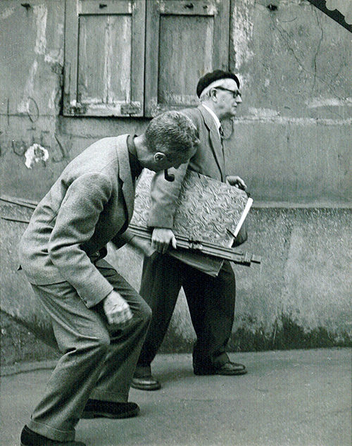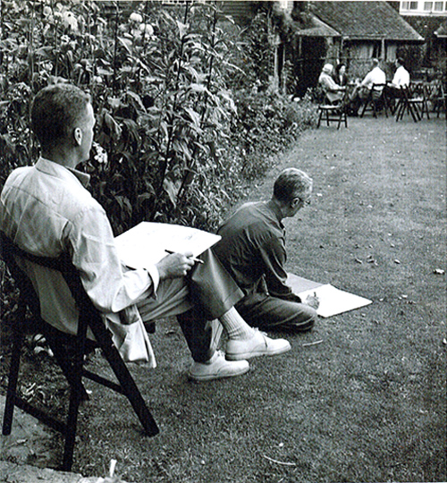 Sketching afternoon English tea. To the right, a colleague is shown where to place his feet. Wouldn't be surprised if they're near the banks of the Seine.