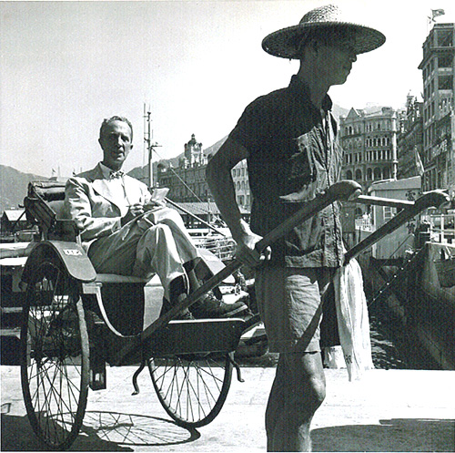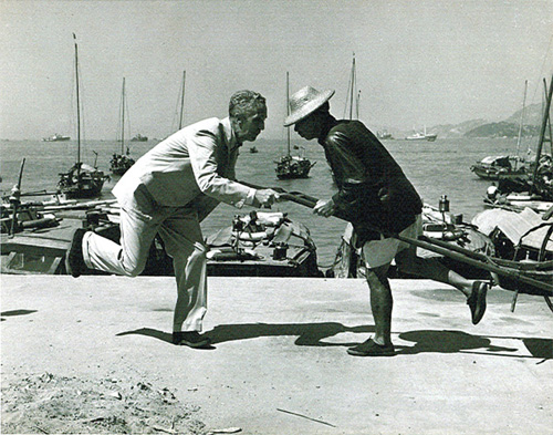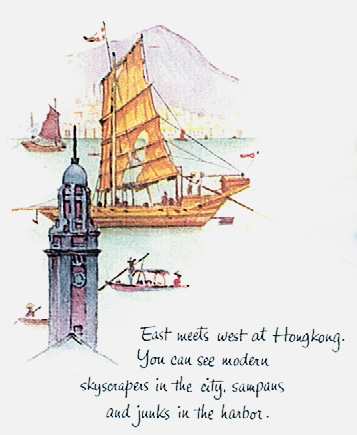"We went to see the royal barges which were very long boats called supannahong royal barges. These are used for state ceremonies and by royal princes on the river [Royal Barge Procession]. The King sits on a throne which is set on a platform a little aft of amidships. The boat was narrow, about 125 to 200 feet long. The front of the boat is gold and shaped like a serpent's head. There are hideous guards mounted on the front of the escort boats and a hole is dead center where they fired the cannon. The guards have blue faces, gilded claws and wings protruding from their backs. You will see in the shops many beautiful pieces of jade jewelry. The jade is brought down form communist China. It is cut and set in bracelets, rings, etc. However, I will caution anyone buying these things because it is difficult to bring them into the U.S., in fact, it is impossible because jade is only known to come from communist China. Even though I have mentioned that the city is made up of canals and rivers, there is a section of the town built up with modern buildings and streets. Our hotel, the Park was on dry land and there were five or six individual buildings. Each building had three or four rooms. The mosquitoes are quite bad down here. This is a nice hotel in that we had air conditioning. All through the warm climates we found air conditioned hotels. At 2:30 am we boarded the round-the-world plane for Hong Kong. Coming into Hong Kong is a beautiful sight. The bay is completely surrounded by mountains—the city is situated at the base of a mountainous island. The mainland, Kowloon, is across the bay. Because of the mountains, it is a difficult airport. However, Pan Am pilots fly in and out of here frequently, so they are thoroughly familiar with every condition. This is a wonderful city after coming from the Middle East, where it isn't particularly clean, where you have to watch your food, diet and not drink the water. Hong Kong, being run by the British, is a beautiful city, very clean. After walking around through town, you realize the British are running the show, but you never seem to see them. They are sort of behind the scenes. The police are native Chinese wearing British uniforms. To start describing Hong Kong—this is where you see attractive women wearing split skirts. The split will range anywhere from the knee on up. As Mr. Rockwell says, there should be zippers on these skirts so they can, depending upon how they feel in the morning, put it at any length they want. Most of the dresses are made of silk with straight lines, no belts and with high collars. The split skirt was a topic of conversation among the men and the women we met. (I get the feeling the trio brought up the subject first. Editor) In the harbor, which is one of the most fascinating in the world, are these marvelous junks. To me, they look like the ships that Columbus sailed, only on a smaller scale. They have large sterns, built up quite high. Attached to the masts are the most disreputable, picturesque sails I think I have ever seen, patched with all sorts of color and of course, it makes them ideal from a picture standpoint. I understand that although they look very clumsy, they really are quite maneuverable." This ends the comments by my father and Norman.