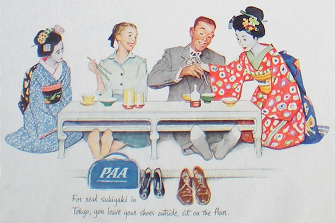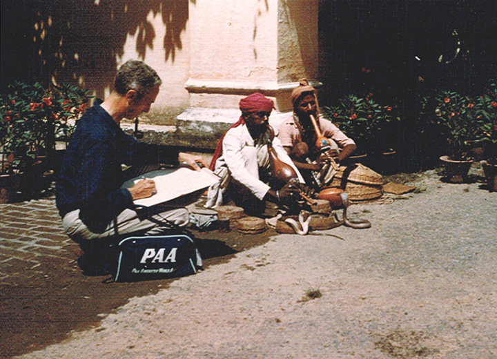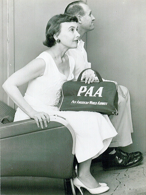 In Asia, they went to New Delhi, Calcutta, Banares, Rangoon, Bangkok, Hong Kong and Tokyo. Only three sketches came out of it: a colorful dining scene with geisha girls in Tokyo, a small scene of the Hong Kong harbor and a small black & white picture of the Temple of the Emerald Buddha in Bangkok that gets lost below a huge color picture of a Hawaiian outrigger canoe. The sketch above by Mr. Rockwell is quite interesting, I include it on this page because it is kind of a composite picture of all of South Asia but it is actually Karachi. Back then Karachi was more Asian than Middle Eastern. Today the converse is true. There's an elephant in the picture. The only one they saw on the trip was in India. In the autobiography I quoted on the first page, he called the sketch, "a camel-elephant-water buffalo-bicycle-and-beggar-thronged street in Karachi." And in a note to my dad (on the last page) once they returned home, Norman wrote, "Wait till you see Karachi!" He obviously considered this possibly the best artwork of the trip. As far as I know he never went further with it. It never was an ad, which is a shame because I think it would have been great. My dad wrote this on the back of a picture of he and I posing* for Rockwell, regarding this scene: "Pan Am didn't buy the idea because of the times-- India and Pakistan were at war and white supremacy was an issue. The whole picture was gray and sepia tones except for the white tourists." (Note: I only have a b&w copy. I gave it a sepia tone look with Photoshop. Also, I think British rule was still fresh in the minds of Pakistanis and Indians, that's why the term "white supremacy" was used.) The two tourists in the bicycle taxi are my parents. Our whole family traveled twice to see Norman Rockwell. We visited him at his Stockbridge Mass. studio and we went down to Florida for some Panagra (Pan American-Grace Airways) ads and to sit for pictures for the Pan Am around-the-world layouts. That's my parents to the right sitting for the scene on top. They look very Rockwellian, don't you think? My dad also posed for several Hawaii shots that you'll see on the next page. I even got to pose, which you'll see on the last page. The story continues in Calcutta: BILL HOUSE: "Our flight to Calcutta was quite exciting especially when we passed the Taj Mahal about 100 miles south of New Delhi. The captain pointed it out to us on the left side of our ship and everybody crammed the windows, looking out. We had a beautiful view of the Taj Mahal right on the river. The Taj is a beautiful building, dome shaped, ivory carved. You could almost see the ivory carvings from the plane. It's about a four hour taxi ride from New Delhi but well worth the effort. The Taj is one of the seven wonders of the world. It sits on the river and of course, everyone says it must be seen by moonlight. After leaving Karachi and the Taj, you fly across India, and at this time of the year it is a wonderful brilliant green color. You see the rice paddies down below, the rivers winding around and the little villages. It has the feeling of a never, never land. We landed in Calcutta at the Dum Dum Airport [Now called the Netaji Subhash Chandra Bose International Airport]. Here again we were met by Pan American personnel. We were very fortunate to hit India just after the monsoon season. Everything was so beautiful, fresh and green, which was quite a difference from the last time I was here. It was right before the rains when it is hot and very dry. We were very surprised to see how wonderful the climate can be. We drove about a half an hour to the wonderful Grand Hotel which is the old meeting place of the British and Indian Society. The rooms were all tremendous and air conditioned. It made you feel as if you were in a palace. Besides a bedroom, you have a little dressing room and a tile bath. When we arrived, we had all the fifteen pieces of luggage, and we again arrived upstairs with fifteen boys, naturally tipping them all. When you tip them here in India, the exchange rate is about 5 rupees to the dollar. The rupee being about twenty cents will buy in India the same as a dollar in the States." [The rupee is worth about 45 cents now.] |