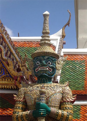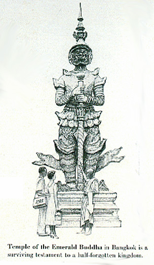 "We continued on our round-the-world flight to Bangkok. Here again, coming into Bangkok, we noticed the tremendous rice fields. The life in Bangkok is centered around the little canals and rivers. All the shops are on stilts with porches. People carry on their trading from boats, selling everything from bananas to cloth. Early morning is the best time to strike out and take a tour in a motor launch because the canals are alive with activity. Some parts of the canals are very much like a jungle, overgrown with many banana trees, and royal palms. On this tour through the canals we also saw a lot of ship builders and, by the way, most of these boats are called sampans. The main river running through Bangkok is the Menam River [Now called the Chao Phraya River]. Here again, of course, the great attraction for the tourist and foreigners is to go to the Temple of the Emerald Buddha [Wat Phra Kaew]. It is stupefying to see the size of these temples. They sit upon about ten or twelve acres of land. These gorgeous temples have taken centuries to build. They are built on the same plan of those in Rangoon. However, here, shiny mosaic tiles are included in the design. We went into the temple yard. As you enter, your attention drifts to the great, enormous, thirty foot statues, as they peer down at you. They are all guardians of the temple. They are meant to frighten away evil spirits and anybody who would molest the temples. I was fascinated by the color they have on them. The faces are generally blue, very hideous with great, staring eyes; decked out with armor and spears. You go on up to the great temple which is the most sacred of all the temples in Bangkok. You are not allowed to bring a camera into the Temple of the Emeral Buddha. There are many people in postures of prayer in a room that I think is the most beautiful I have ever seen in my life. The Emerald Buddha is a very small buddha. It is up on a very high altar, brilliantly lighted. On the walls are marvelous paintings that are kept in beautiful condition. The floor is of magnificent mosaic and the whole thing is absolutely fabulous. I understand this has never been photographed. Blackie started in with his camera, but they made him put it away. It was here in Bangkok that we got the services of a young princess. She put on the costumes of the dancers and Bill will describe that to you." BILL HOUSE: "Girls of the upper class learn how to do these temple dances. The princess that helped us out brought her sister along to act out the male part. They had a dancing teacher along and she put them through their paces, giving us various poses to photograph. The headdress looks just like one of their temples with spires and is quite heavy. The costumes are rich in values of gold, red and blue. The dance consists of moving arms, swaying, advancing and retreating with gliding motions while the fingers are kept bent back to the uttermost. For the shoppers here in Thailand, there's a wonderful shop called Thai Silk. It is a place owned by Jim Thompson. There was an article in Life magazine describing the colorful silks that he produces. He started out as an architect years ago and developed into this line of work. He has his own silk mills, mixes his own dyes and designs fabrics. A woman goes crazy in this place, what with the amount of brilliantly colored silks. We all bought many ties and silk scarves for our wives." [In 1967, Jim Thompson vanished while walking alone in Malaysia’s Cameron Highlands. He was never heard from again. Source: Princeton’s Man Who Knew Too Much. Editor] ROCKWELL: "Jim Thompson invited us over for dinner at his house, he lives in a very beautiful native house [His house is now a museum]. He has a very interesting history himself. As Bill said, he started from Philadelphia as an architect and comes from a very fine family there. He was in the OSS and was parachuted into Bangkok, presumably to handle resistance there when the Japanese had control. The war ended right after he parachuted in, so he was the man who received the surrender of the Japanese. He has lived there ever since and he loves it there. He has built a big industry and is a sort of soldier of fortune, the kind Kipling wrote about. It was very interesting to visit his house because he has one of the finest collections of Burmese art, paintings and sculpture. In all of these countries, their art goes back long before Columbus came to America and it is very fascinating to see. One of their big problems, is their strange allegiance between the old traditions and the new regime, and the new life and government they want to set up. We took a drive out into the country to see some of the farms. Right away you start seeing rice fields, and the farmers, here again, live with their houses on stilts with planks going from the roads right up to the front door. Or they are right on the canal and the only way to get to their house is by boat. Like most of the places where we have been, you could not get the true picture of the place unless you got out into the country and saw how the farmers live. They wore a different dress which is much more colorful. We got a big bang out of one of these little launches when we took this tour down river. There was a fellow steering the boat and then, about not more than 10 feet in back of him, there was a fellow operating the engines and he had signals, bell signals, for everything—one bell, back up—two bells, go ahead and about every five minutes Blackie was stopping him to take a picture. I never heard so much bell ringing in all my life. Each family has their own little shrine stuck on a pole in their yard. About the size of a bird house, these shrines resemble the bigger temples. Inside you will find little gods and other figures. One of these little figures got knocked over and we were told to stand it up, but then we were told it was evil, or a sin for an outsider to touch the temple at all, so we decided to leave well e