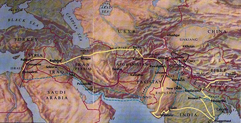 "It is not certain what route Jesus took on his journey to the East. Here is one possible itinerary via ancient roads and trade routes, reconstructed from Notovich, Abhedananda, and Roerich texts and legends: Jesus departed Jerusalem (follow the yellow line), took the Silk Road to Bactra, headed south to Kabul, crossed the Punjab and proceeded to a Jain area on the Kathiawar peninsula where Jain temples were later built bear the town of Palitana. He crossed India to Juggernaut (Puri), made trips to Rajariha (Rajgir), Benares, and other holy cities and, fleeing his enemies went to Kapilavatsu--birthplace of Gautama Buddha. Jesus took a trail just west of Mt. Everest to Lhasa (where the palace of the Dalai Lama was built in the 17th century). On the return trip (follow the violet line), he took the caravan route to Leh, went south to the state of Rajputana and the north to Kabul. He proceeded on the southern trade route through Persia where Zoroastrian priests abandoned him to wild beasts. Jesus survived and arrived unharmed in Jerusalem." Map and text from The Lost Years of Jesus.